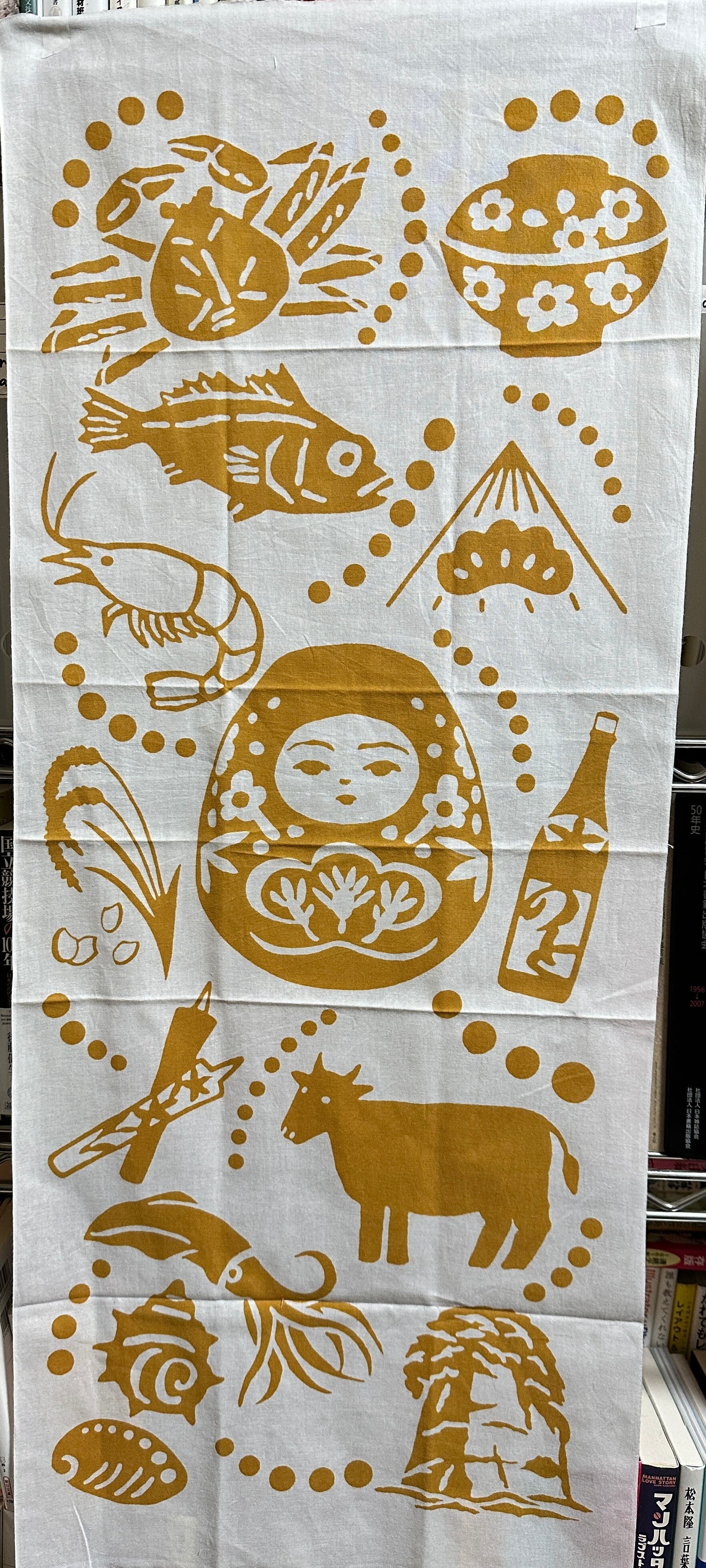 今年1月1日に発生した能登半島地震の被災地を支援するため、チャリティ手ぬぐいを作成しました。能登の風物をデザインしたオリジナルの手ぬぐいです。